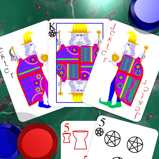 ``Four fives...'' Eris began, then paused. ``Oh, no,'' She corrected Herself. ``Oh, that's much better.'' Eris hurriedly switched Her cards around, a smile spreading across Her face. ``What is the difference,'' She asked excitedly, ``between two Fools and a King?''