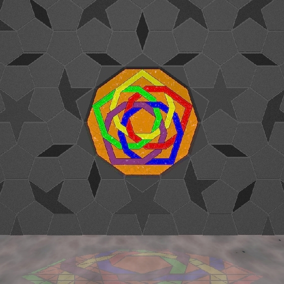 In fact, I liked it so bloody much that I decided to make a new version of it [last page], rather than just leave well enough alone with the old scanned-in, colorized version that used to grace that page. Of course, I decided to do something easy, like a stained-glass window. Then, why not put the window in some kind of stone wall. But not just any stone wall, oh no, not good enough for this masochistic li'l Episkopos. I decided that the wall should be in the form of a Penrose tiling [which is an example of a quasi-fivefold rotational symmetry, which is supposed to be impossible in nature, since you can't tile pentagons non-holistically the way you can tile, for example, squares, triangles and hexagons], and went about figuring out exactly how to do that [and, since the pattern is non-repeating, I had to put the whole thing together pretty much a stone at a time]. Once I had a good plan, I found out that there seems to be a little bug in POVray [which, despite my bitching, is a fantastic package, and is free besides] which prevented me from doing what I originally intended, so I had to do a whole bunch of it over again. What I eventually came up with was a far cry from what I wanted, but I was really, really sick of looking at it after almost three months, so I just called it ``done'' and went on with my life.